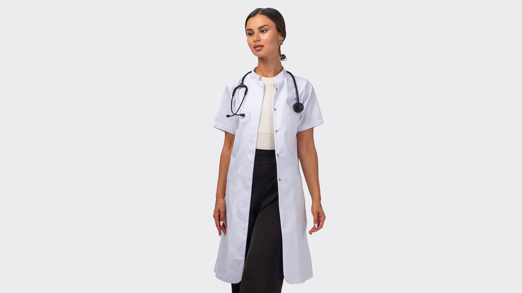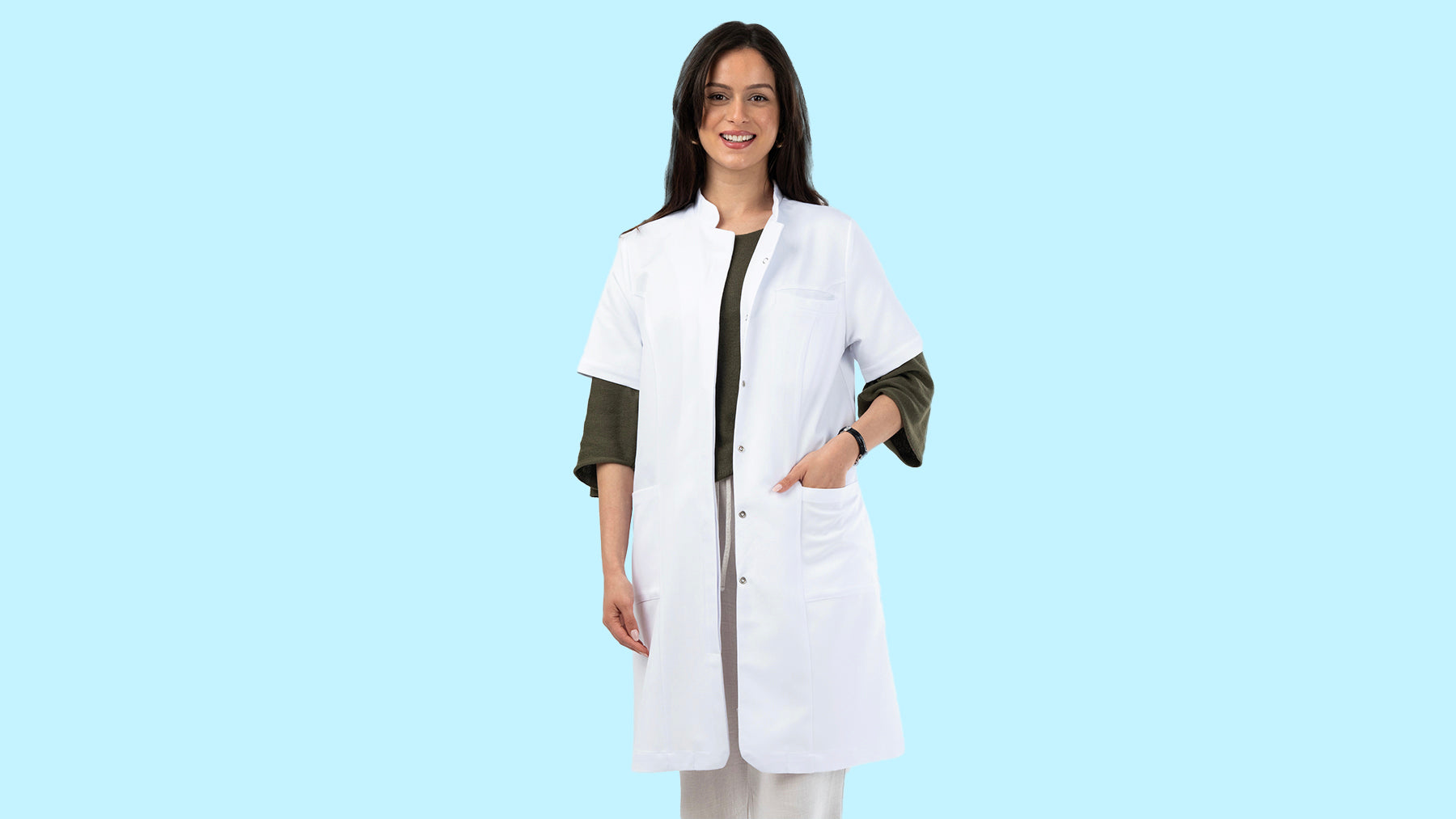 Nous avons remplacé les traitements chimiques par un tissu naturellement performant. Plus stable, plus propre, plus durable. Le tissu reste éclatant, garde sa blancheur, se froisse moins et offre un tombé net, pour un look soigné du matin jusqu’au dernier patient.